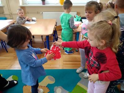 W ramach programu Ministerstwa Edukacji dzieci uczestniczyły w Tygodniu Budowania Relacji. Codziennie rozmawialiśmy o przyjaźni, pomaganiu, emocjach i wspólnym spędzaniu czasu. Były zabawy integracyjne, wspólne rysowanie, tańce i dużo śmiechu! Dzieci z grupy Smerfy w ramach wzmacniania więzi i uczenia się jak być dobrym kolegą i koleżanką wykonały piękne serduszka, które wręczyły dzieciom młodszym z grupy Pszczółki. Odbylo się także spotkanie z panią psycholog, podczas którego rozmawialiśmy o radości i empatii a na koniec spotkania przedszkolaki wykonały drzewko radości z odbitych w farbie rączek.