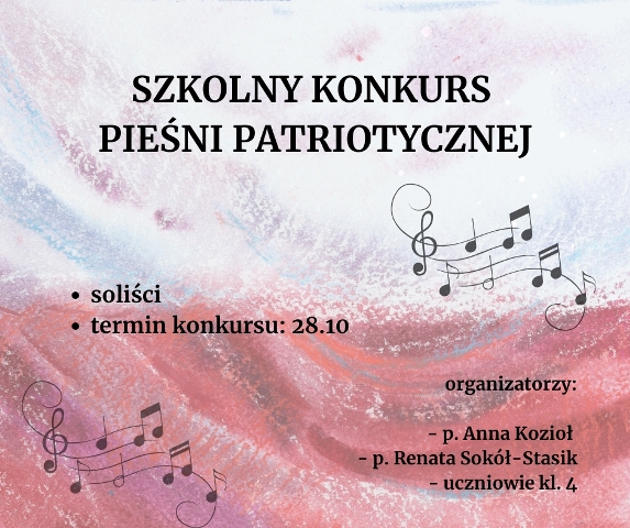 Zapraszamy do udziału w konkursie - wyłonimy reprezentantów naszej szkoły na gminny Konkurs Pieśni Patriotycznych, który odbędzie się 5 listopada w Domu Kultury Pilzno.
