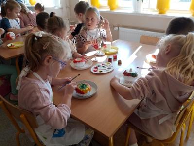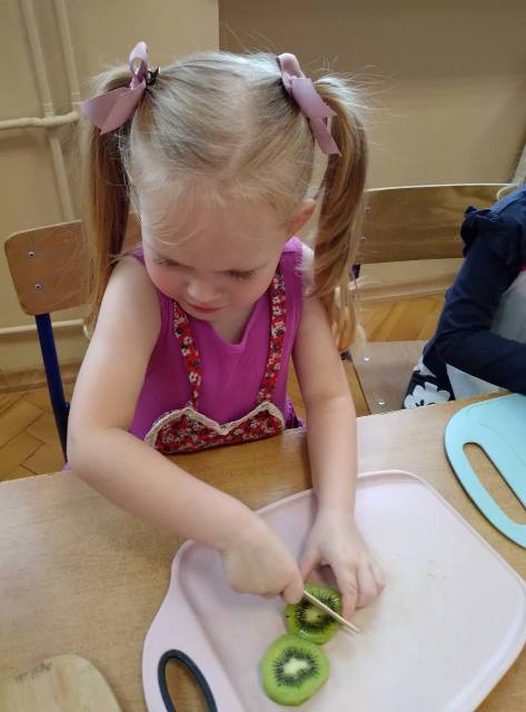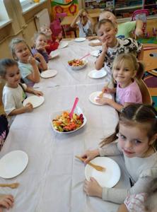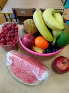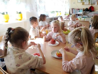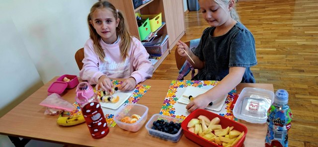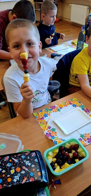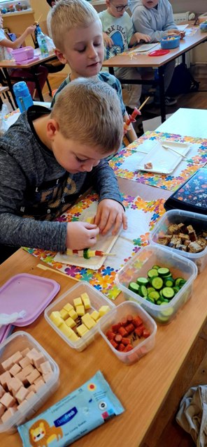 Pierwszoklasiści przygotowywali na edukacji przyrodniczej koreczki z ulubionych, a przy tym różnorodnych i wartościowych składników, takich jak: świeże owoce, pieczywo, wędliny, sery. Niektórzy dodatkowo wzbogacili swoje drugie śniadanie o kubeczek jogurtu. Aktywność ta umożliwiła uczniom nie tylko rozwijanie sprawności manualnej, ale przede wszystkim ugruntowanie wiedzy na temat komponowania zbilansowanego posiłku. Była to cenna lekcja, która w atrakcyjny sposób kształtuje prawidłowe nawyki żywieniowe.