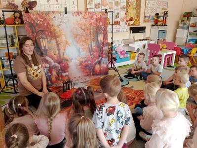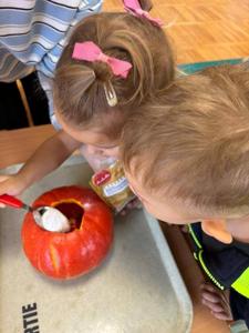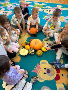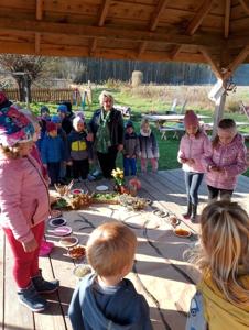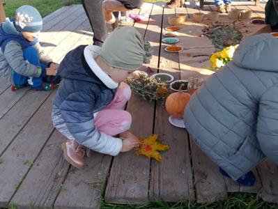 - Warsztaty plastyczne, podczas których dzieci ozdabiały jesienne pojemniczki w kształcie żołędzia lub dyni a następnie wypełniały je ,,skarbami jesiennymi".