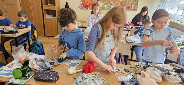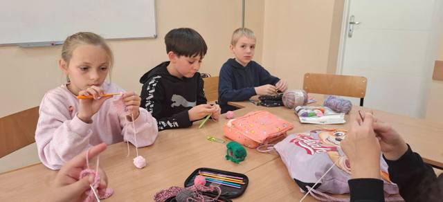 Czwartoklasiści wciąż pełni zapału do szydełkowania. Breloczek-pierożek to pierwsza praca na tegorocznych zajęciach kółka. Dzięki p. Annie Kozioł uczniowie stawiają również pierwsze kroki w obsłudze maszyny do szycia, która została zakupiona w ramach Laboratorium Przyszłości.